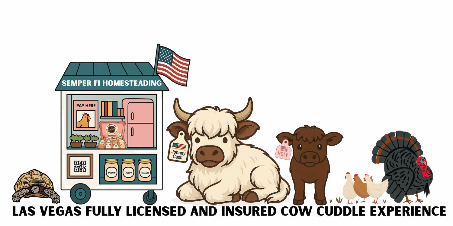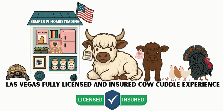 Welcome to Semper Fi Homesteading... Las Vegas first fully licensed and insured Cow Cuddle Experience!!! Please book your experience through the Book a Private Cow Cuddle Experience Tab.